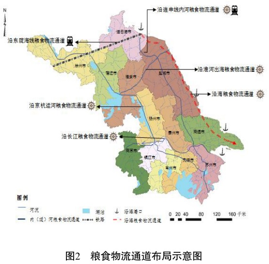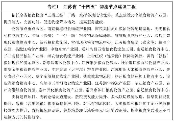强化粮食物流通道能力。针对不同区域特点补齐设施短板,强化功能升级,加强通道衔接,增强东陇海线、淮河出海线、沿长江、沿海、沿京杭运河线、沿连申内河线“三横三纵”粮食物流通道能力。加强徐州(新沂、沛县)、连云港等粮食物流节点建设,推动东陇海线通道铁路粮食物流干线运输组织模式向班列化方式转变,提高新亚欧大陆桥铁路运输、铁海联运和国际粮食物流通行能力。加强南京、泰州、苏州、南通等散粮仓储与物流设施建设,重点提升沿长江通道粮食接卸、江海联运、分拨集散能力,提高服务长江经济带的粮食多式联运效率。加强淮安、宿迁等物流节点集散能力,提升沿淮河出海线内河散粮运输和成品粮集装箱运输功能。加快连云港、盐城(大丰港)、南通(通州湾)等港口铁路支线建设,提升沿海通道粮食专用码头、专业散粮设施、多式联运转运设施、通用集装箱装卸设施功能。加强扬州、常州、无锡等散粮仓储与物流节点建设,提升沿京杭运河线通道粮食接卸、水水中转和分拨集散能力。加强连云港、盐城、南通等多式联运物流节点与粮食产区对接,提升沿连申内河线铁水联运、河海联运等功能,发展铁水散粮运输和成品粮集装箱运输。
