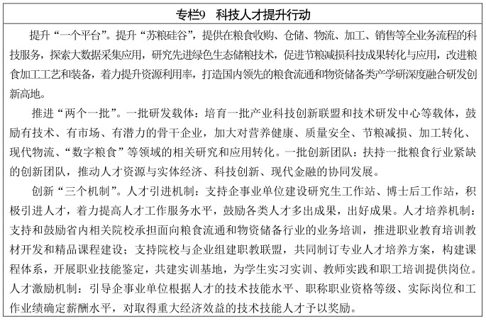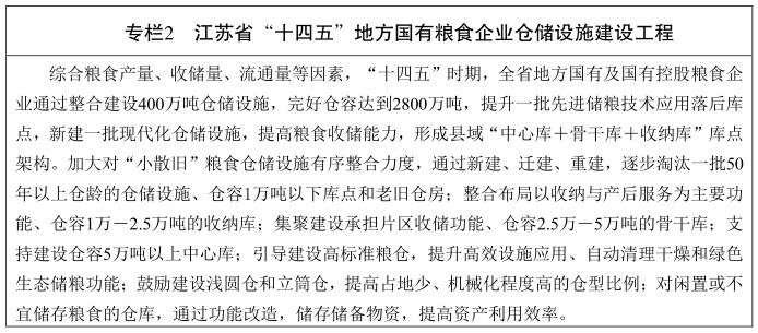 粮食仓储物流高效能。沿海、沿江、沿运河、沿东陇海线粮食物流通道能力进一步增强,仓储物流设施结构和布局更加优化,物流园区和高标准仓库建设进一步推进,绿色储粮生态化、设施设备现代化、仓储管理精准化、物流网络智慧化水平显著提升。全省完好仓容达到4200万吨,其中,地方国有及国有控股粮食企业完好仓容达到2800万吨。