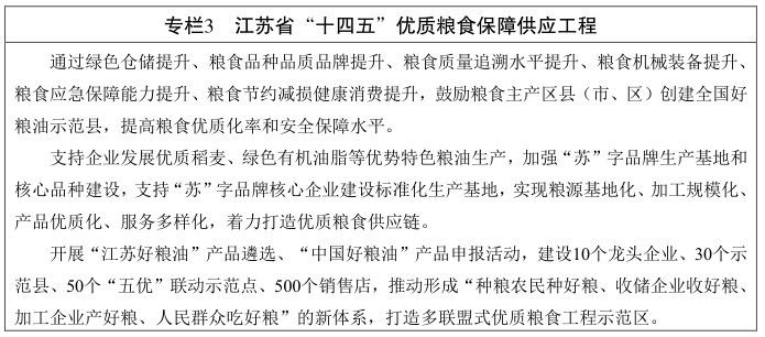全面促进“五优联动”。促进“优粮优产”,积极创建全国好粮油示范县,加强优质粮食核心生产基地和核心品种建设,全省粮食优质化率提高30%以上;促进“优粮优购”,提升粮食质量安全检验监测水平,引导收购环节强化质量导向;促进“优粮优储”,建设高标准粮仓,引导分等分仓储存和精细化管理;促进“优粮优加”,扩大优质产能,引导粮食深加工向高附加值领域延伸,鼓励对粮油加工副产物综合循环利用;促进“优粮优销”,以“水韵苏米”为引领,着力增品种、提品质、创品牌,发挥龙头骨干企业主渠道作用,畅通优质粮油市场供应“最后一公里”。