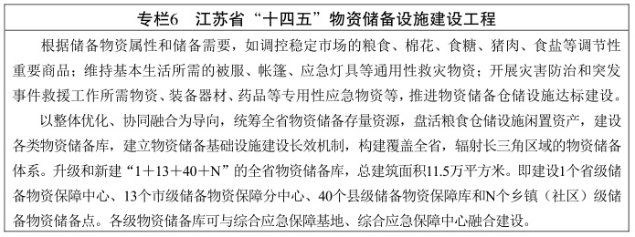 提升物资储备设施水平。新建或改扩建一批技术先进、经济高效、绿色环保、平急结合的省、市、县三级物资储备库。多灾易灾和人口较多的市县,应按上限标准确定储备库建设规模,并根据实际适当增加储备库点。制定江苏物资储备库建设标准,按照启动自然灾害救助应急预案Ⅱ级响应需求,推进物资储备库规模达标建设,其中,省级建筑面积10000平方米以上,市级建筑面积5000平方米以上,县级建筑面积1000平方米以上。充分利用好全社会仓储资源,加快物资储备设施标准化、信息化、智能化改造。