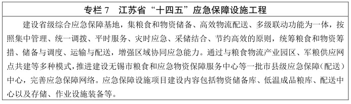 健全现代应急物流体系。建立完善应急物流网络,提高复杂条件下应急运输快速响应能力和协同保障能力。依托国家级和省级示范物流园区等,推进应急物流基地和应急物流转运场站建设。提高应急物流技术装备水平,发展快速通达、转运装卸和“无接触”技术装备。整合全省应急运力,构建全程“一站式”、全省无盲点、城配一体化的全省运力一张网,保障紧急情况下粮食和应急物资快速通行。