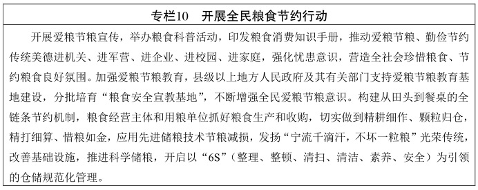 推进重点环节节粮减损。加强粮食生产、储存、运输、加工等重点环节的损失治理。发挥好粮食产后服务中心作用,着力提高粮食清理烘干能力,推动净粮入仓、颗粒归仓。推广运用粮食仓储新技术、新工艺、新装备,推动集约储粮新模式。发展新型粮食运输装备,提升粮食运输现代化和装卸智能化水平。引导支持企业适度加工,推广高效低耗新技术,提高成品粮出品率和原粮利用率,提高粮油加工副产品综合利用率。